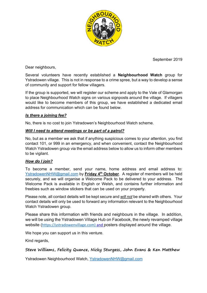 Neighbourhood Watch PDF copy of letternhw-ystradowen-introductory-letter-sept-2019Download Share this: Share on Facebook (Opens in new window) Facebook Share on X (Opens in new window) X Email a link to a friend (Opens in new window) Email Print (Opens in new window) Print Like Loading...