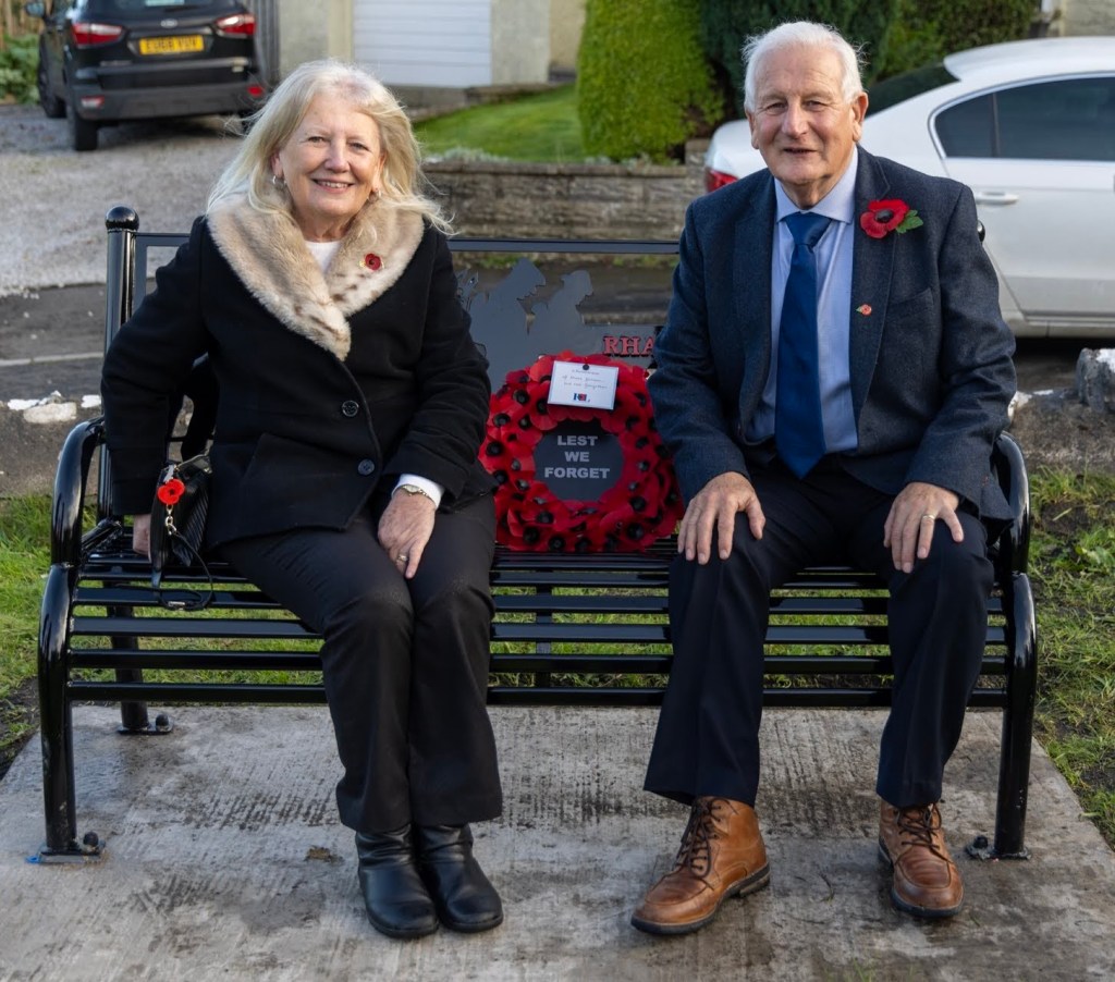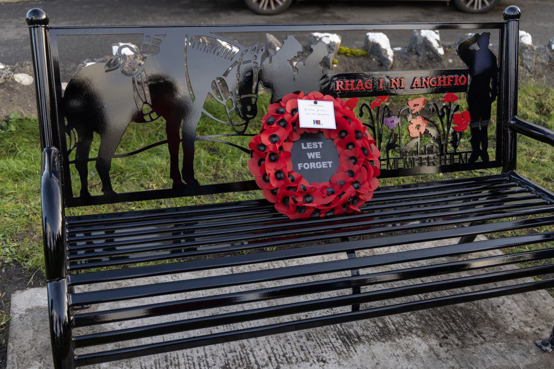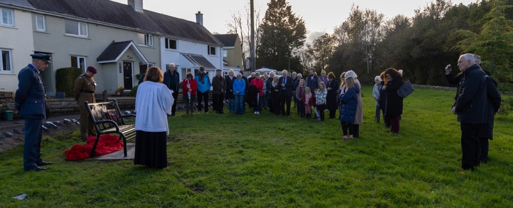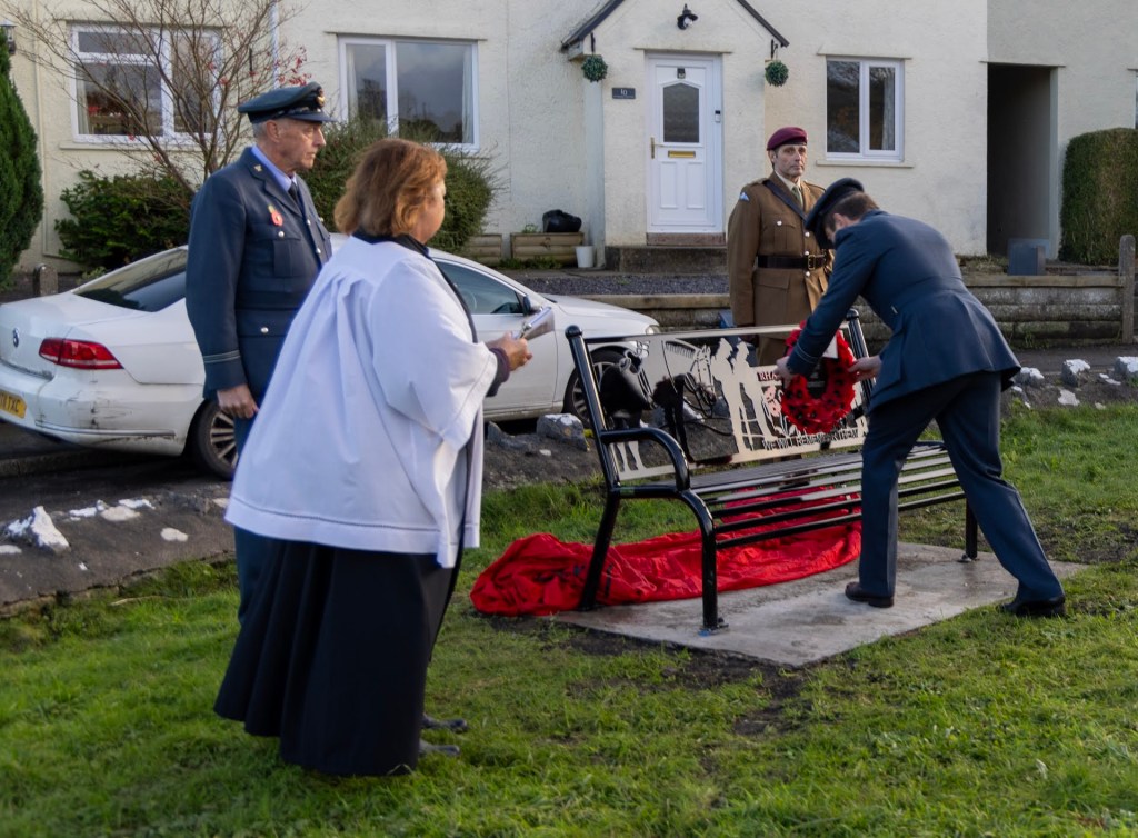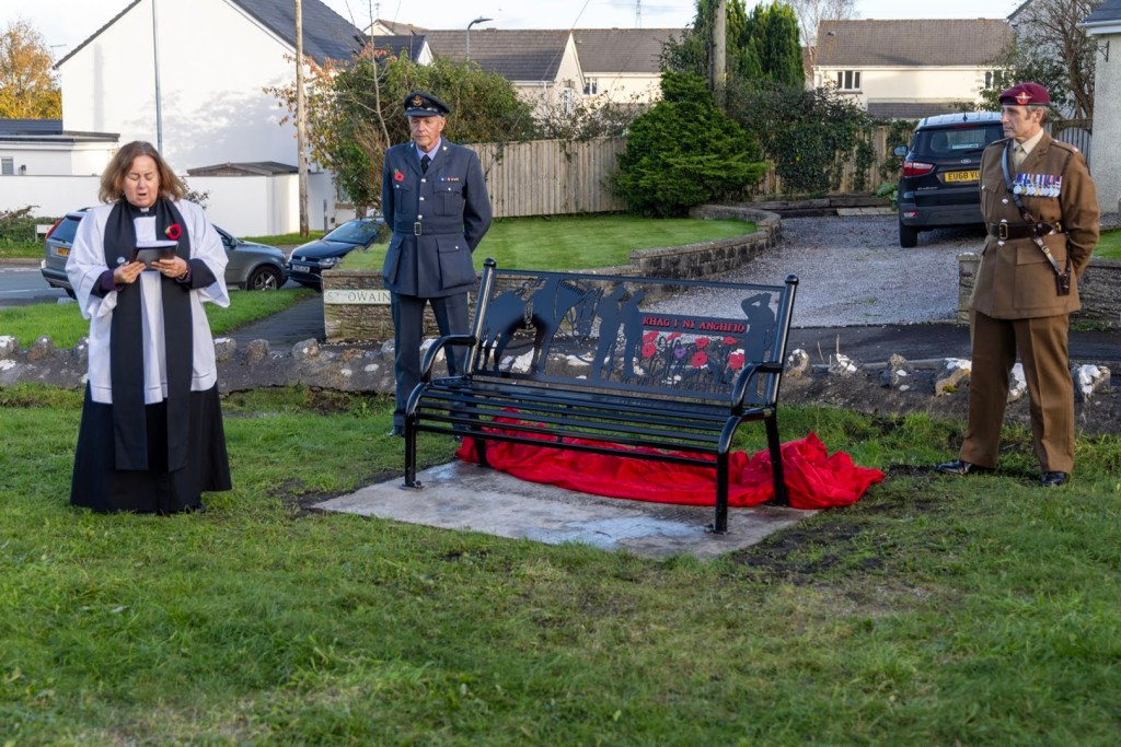 All was arranged in something of a rush in order to get the Warhorse Bench made, with bilingual text, installed and secured in time for Remembrance week 2023. We were very grateful that local families offered to make contact with representatives of the Forces which enabled us to arrange a short but important ceremony to inaugurate the bench on Sunday 5th November 2023.